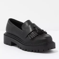 A chunky sole adds a cool edge to this classic tassel loafer in soft vegan leather.